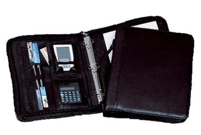 Product Description : Made of full grain leather buffed cowhide.The outer shell is completely foam padded. Inside there is a large interior pocket and numerous business/credit card slots. Pen slot. 8 1/2" x 11" ruled memo pad included. Large Interior pocket for papers. Includes calculator and PDA holder. 1 1/2" binder rings. Easy-carry binding handle.